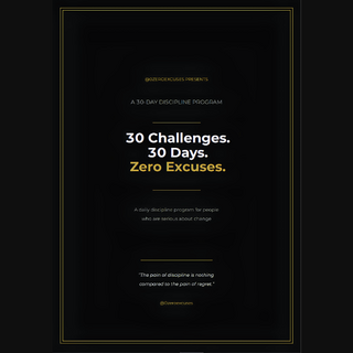 Most people talk about change. This book makes you do it. This is a 30-day discipline program — one real challenge per day, designed to break your comfort zone, rebuild your habits, and turn discipline into your default setting. What's inside: — 30 daily challenges across 5 areas: foundation, mental toughness, physical discipline, focus & productivity, and mindset — Every challenge comes with a full explanation of WHY it works — Clear action steps so you know exactly what to do each day — Powerful quotes from Marcus Aurelius, David Goggins, Kobe Bryant, Bruce Lee and more — A closing message and personal code of discipline to carry with you after Day 30 This is for you if: — You're tired of starting over every Monday — You know what you need to do but keep avoiding it — You want results, not inspiration This is NOT for you if: — You're looking for something easy — You need someone to be gentle with you 34 pages. No fluff. No excuses. Start today or stay the same. — @0zeroexcuses