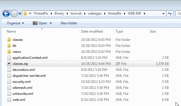 This will start tomcat, and more importantly extract the threadfix.war file into the webapps folder, where I zipped the classes folder: