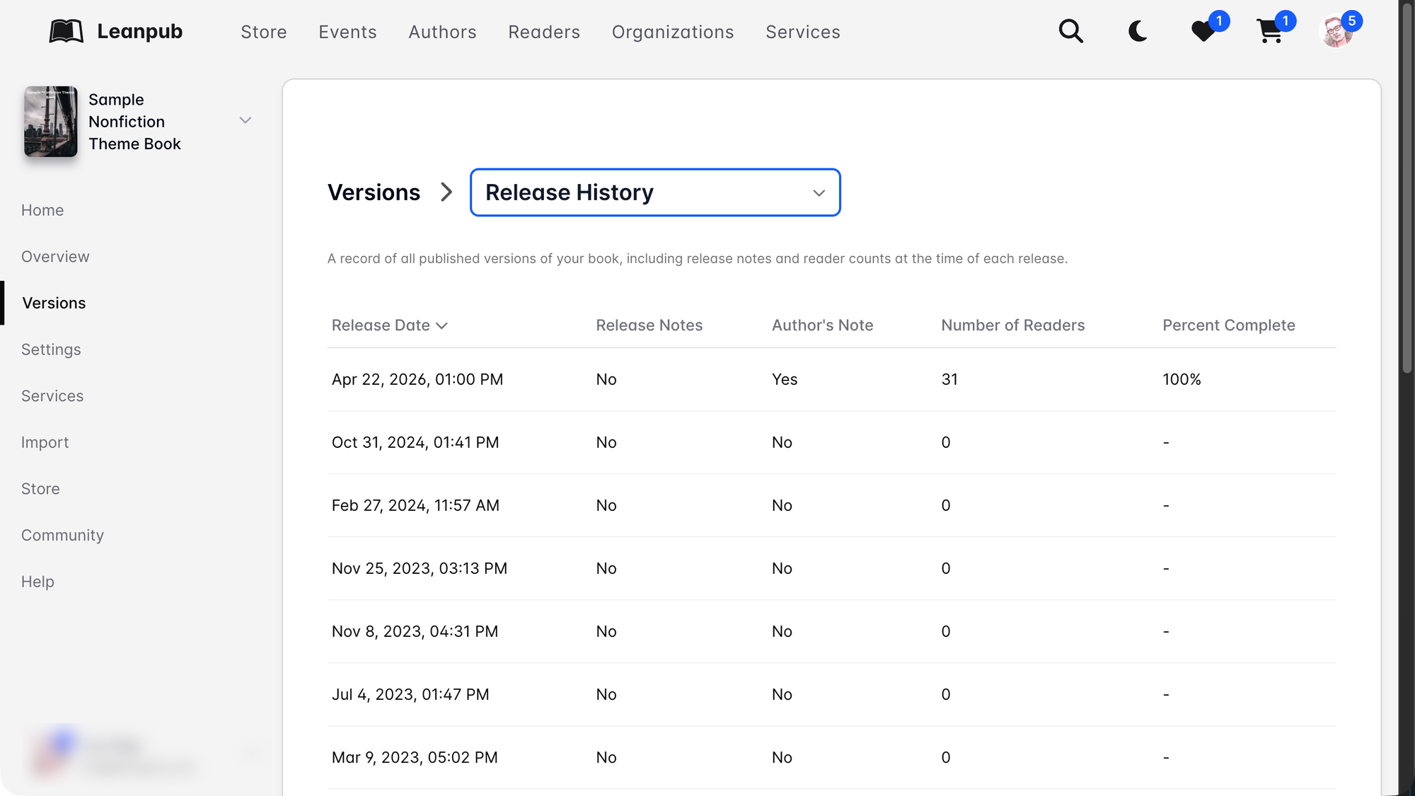 Since Leanpub encourages authors to "Publish Early, Publish Often", the Release History page makes sure all your efforts aren't just lost to memory, but are systematically tracked.