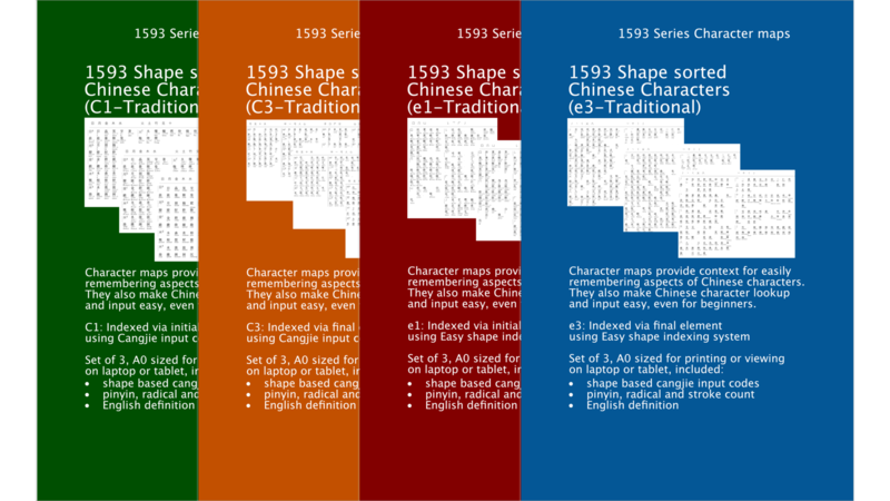 The 1593 series of character maps includes 1593 Traditional Chinese characters. These are all characters that appear in the context of words. So learning them is a little like learning the alphabet. Plus these 1593 characters are all fitted onto a single a0 (reduceable and printable on a1 size) page. However, there are three pages. Each includes different details.