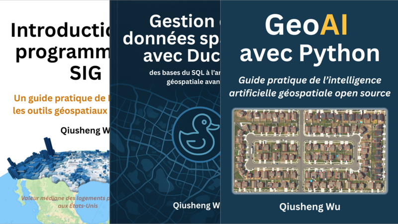 Libérez la puissance de DuckDB pour l’analytique géospatiale moderne. Ce guide pratique aide les professionnels du SIG à maîtriser une gestion efficace des données spatiales, en transformant d’énormes jeux de données réels en informations exploitables grâce au SQL, à Python et à l’extension spatiale de DuckDB. Une édition papier couleur est disponible sur Amazon.