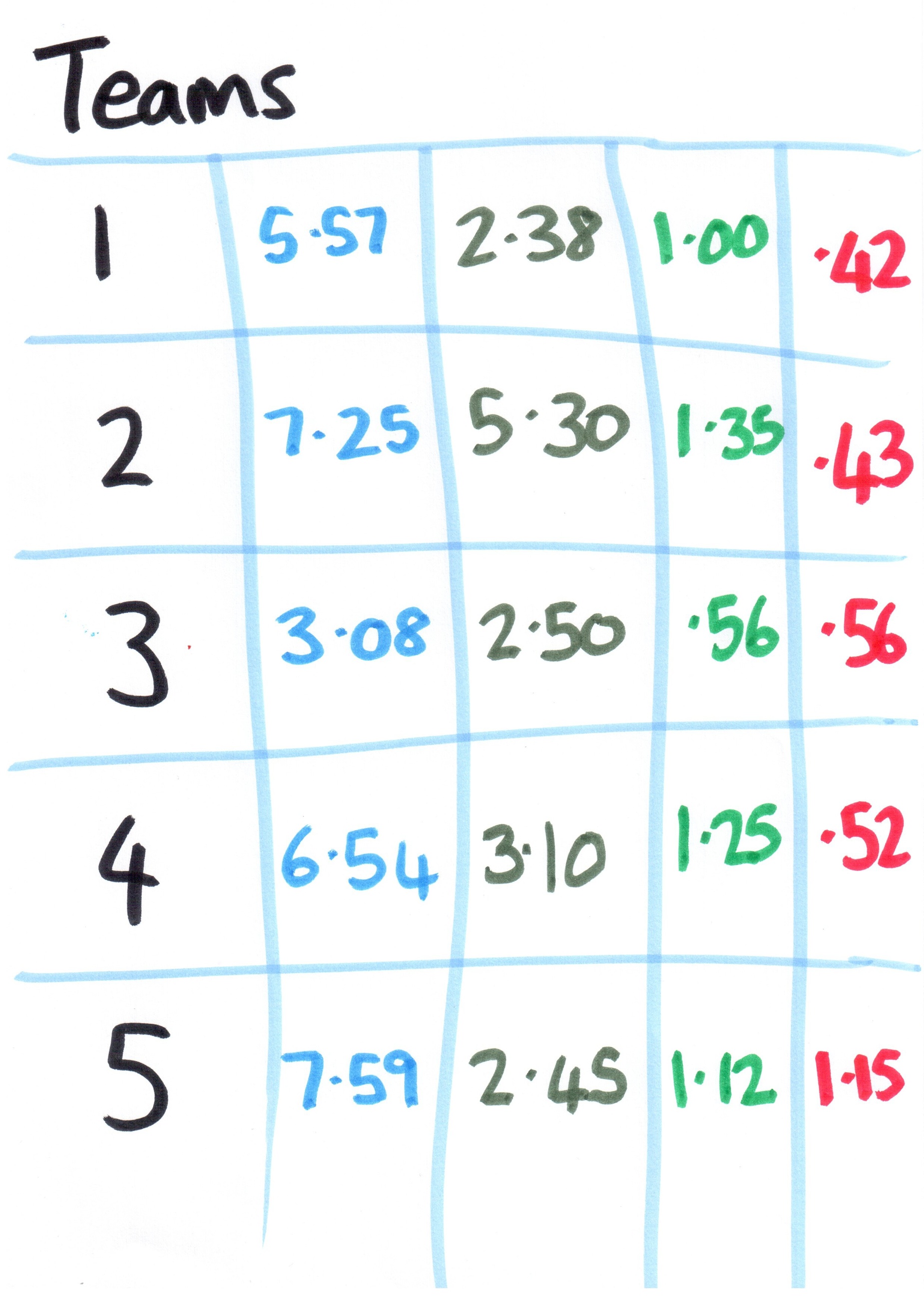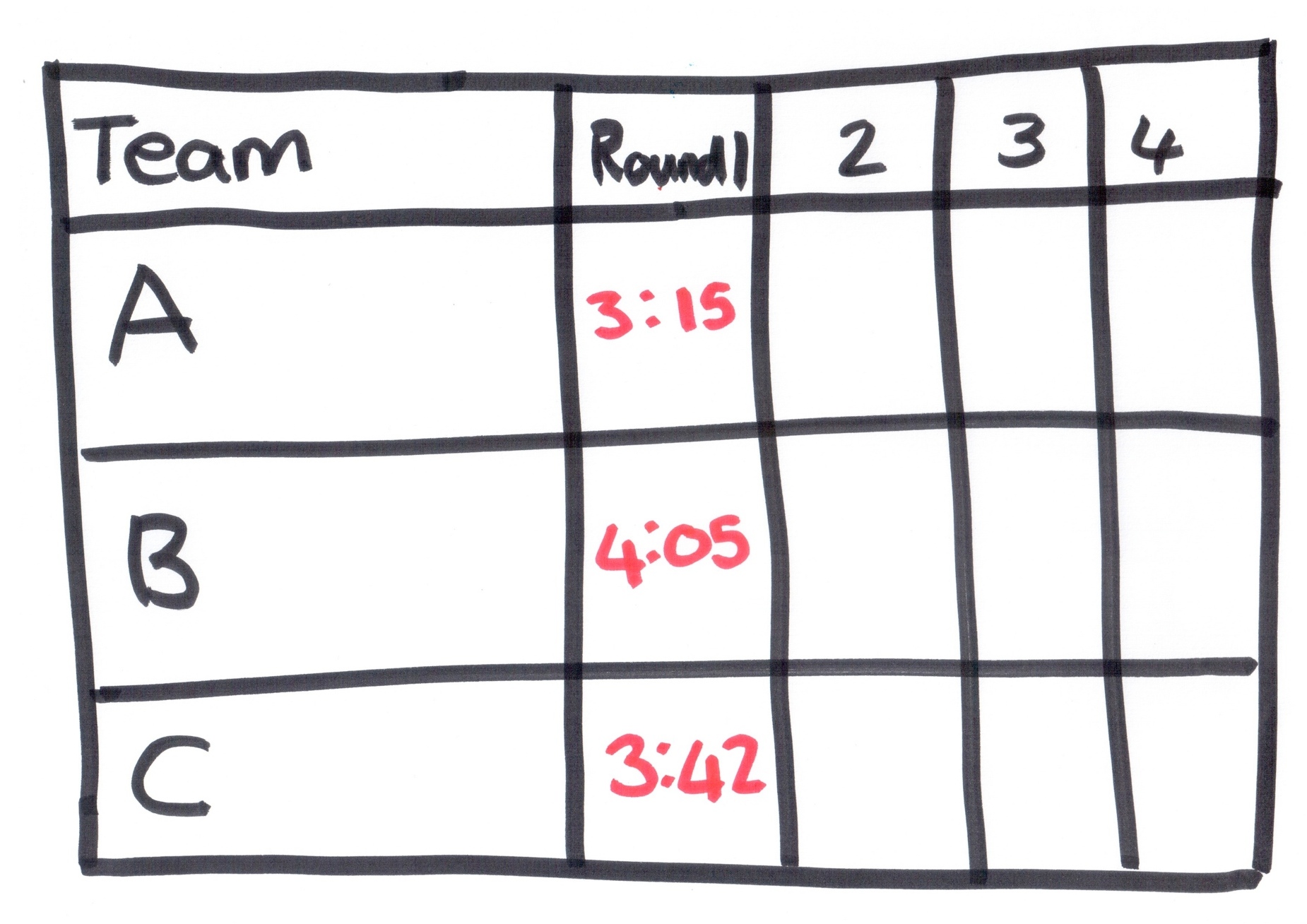 Now debrief the game. Start by asking people what they notice with the times. In our experience the times for the last two rounds are fractions of the original time. Below is a copy of the results from one of the times we have run this game.