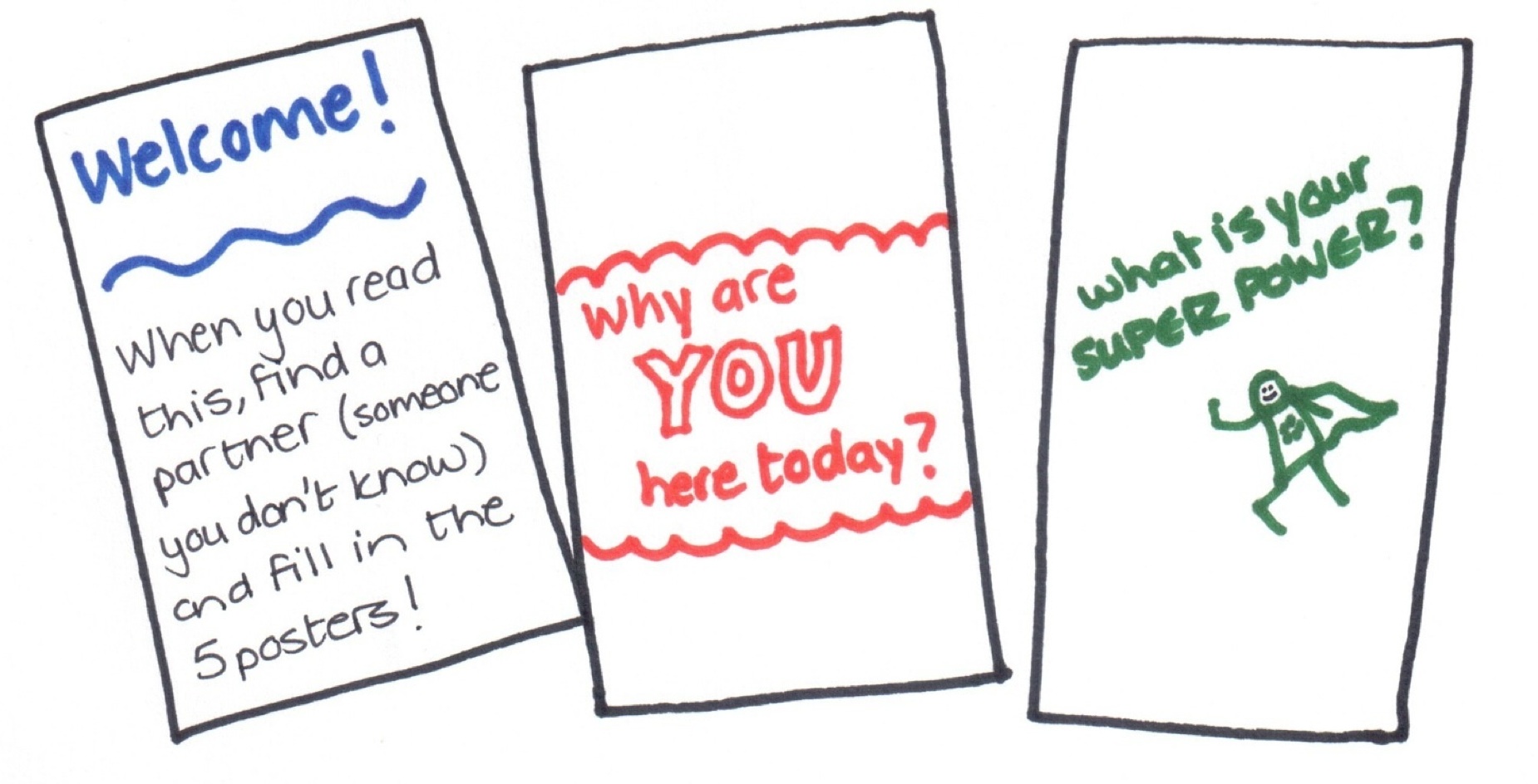 Instruction flipchart:”After reading this, introduce yourself to a stranger and fill in the flipchart questions around the room with them.”