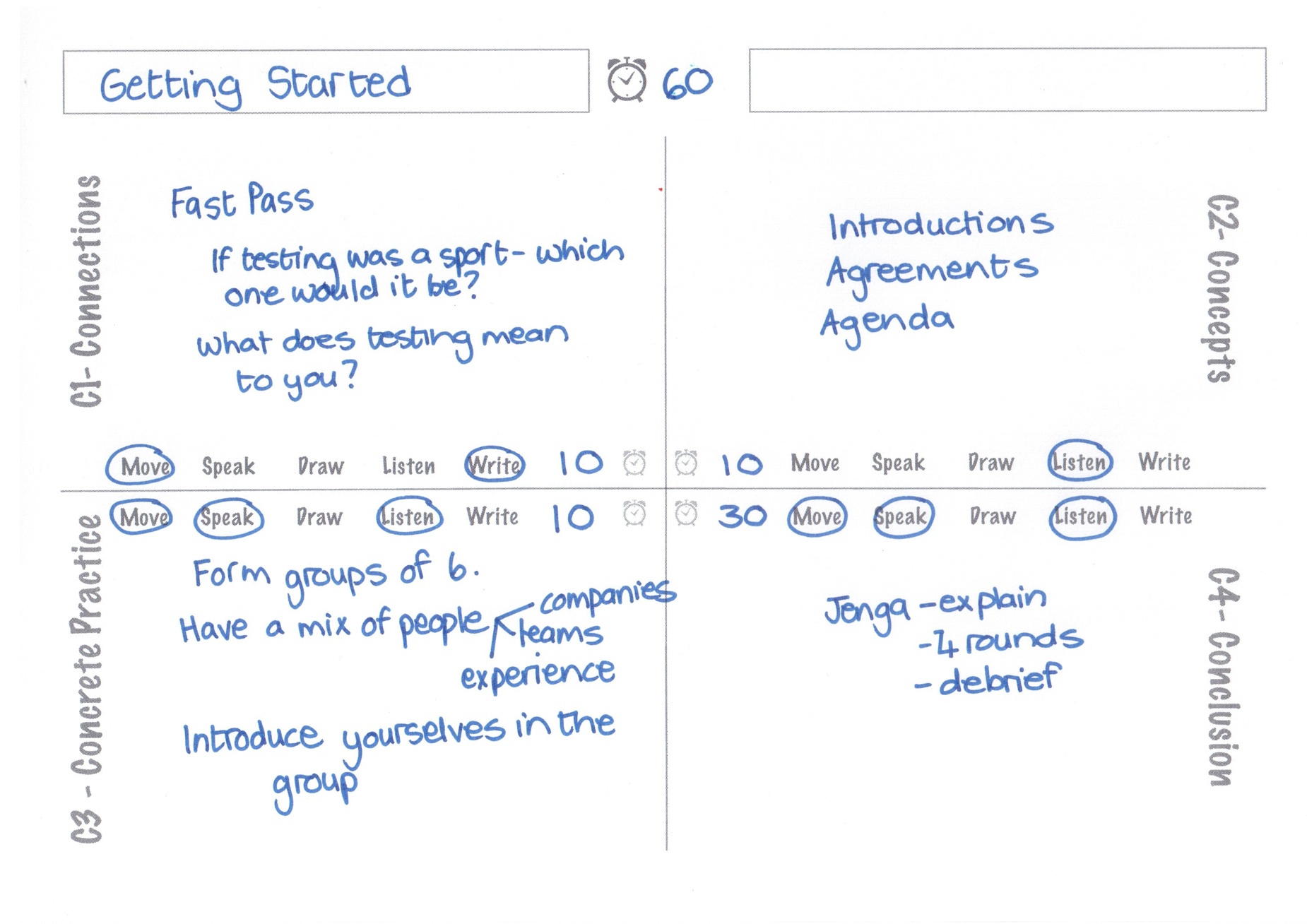 We spend time at the start of a workshop session building connections and getting people to bond with each other and us. This immediately increases the level of trust in the room. If you are running a 90 minute workshop with people who all work together, you don’t need to spend as much time on this. In that case we might only do the Jenga Game in C4. If you are doing a full day session with people who don’t know each other well, we’d recommend following the full plan below.