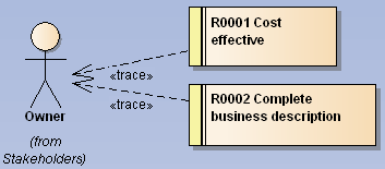 Place a Requirements folder inside CIM and create a Requirements diagram inside. Eventually you will need some structure for functional and non-functional requirements later. But for now if you happen to find a requirement from any stakeholder just drag the actor as link onto the diagram (you might as well use instances and name the concrete person) create a Requirement from the toolbox and <<trace>> it to the actor.