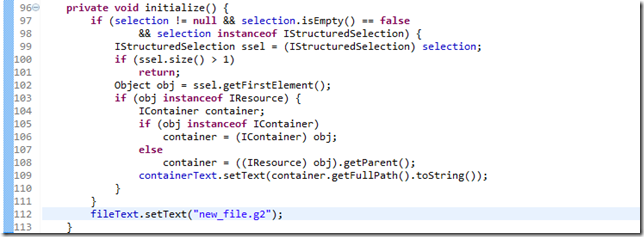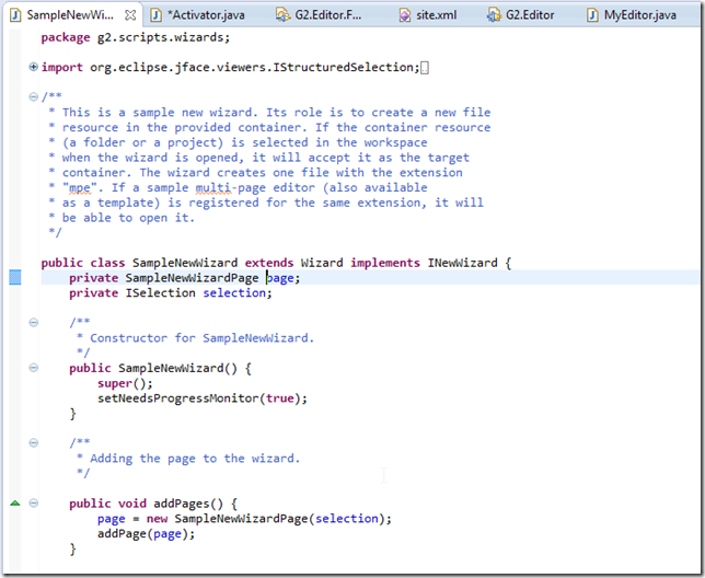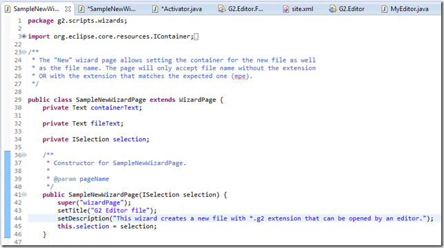 The SampleNewWizardPage.java, is also just about the same as the original version, with only a small change on the file extension.