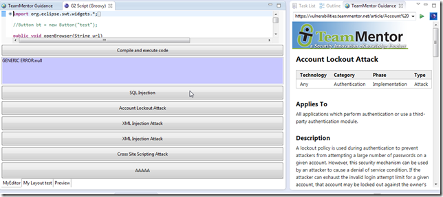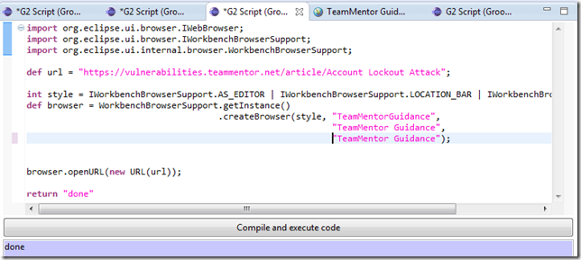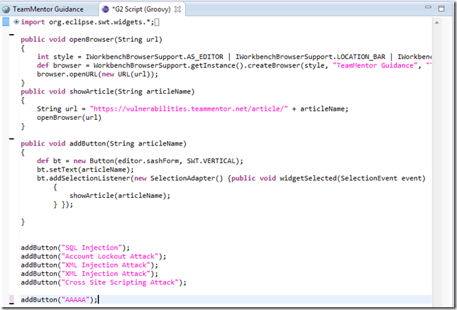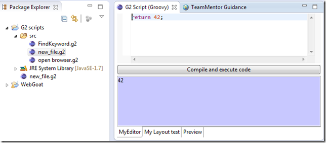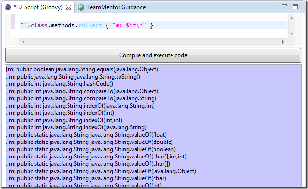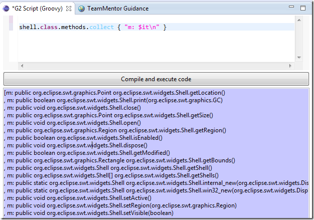 Btw: I’m pretty sure there are easier ways to do this, and it would be great if I could get some help with the next versions (for example I had probs using the GroovyEditor outside an Eclipse Editor/Page environment and I was not sure how to enable CodeComplete/Intelisense to the GooryEditor)
