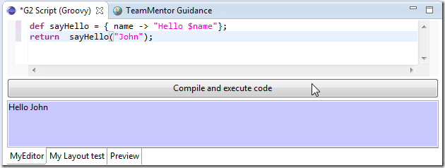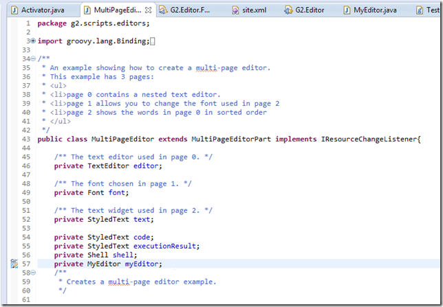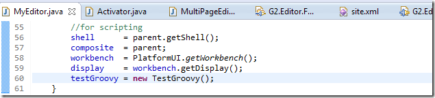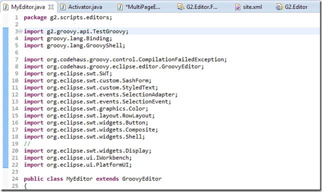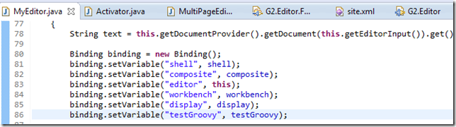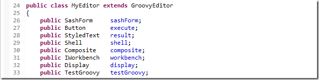 The MyEditor class extends the GroovyEditor with a number of extra variables that will be made available to the Groovy script: