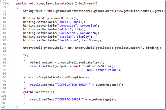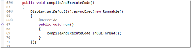 The compileAndExecuteCode method is used to execute the compileAndExecuteCode_InGuiThread in the current UI thread (so that any uses of UI objects don’t throw ‘thread access exceptions’):