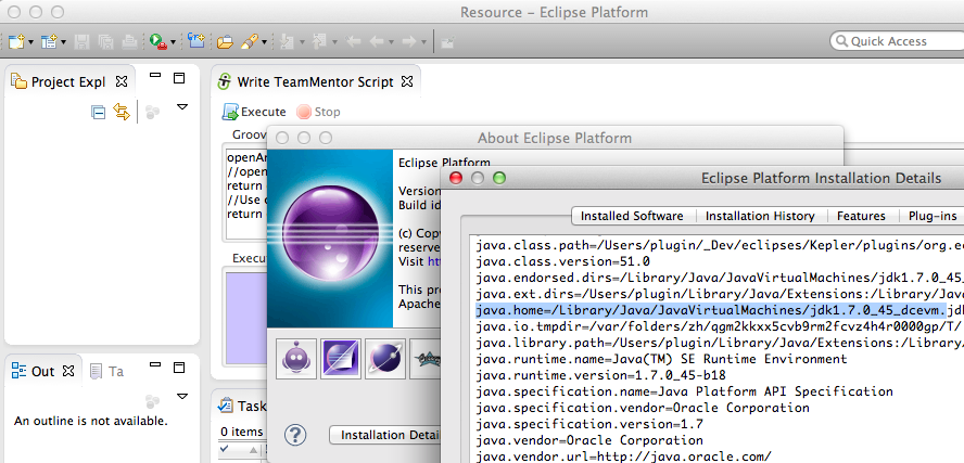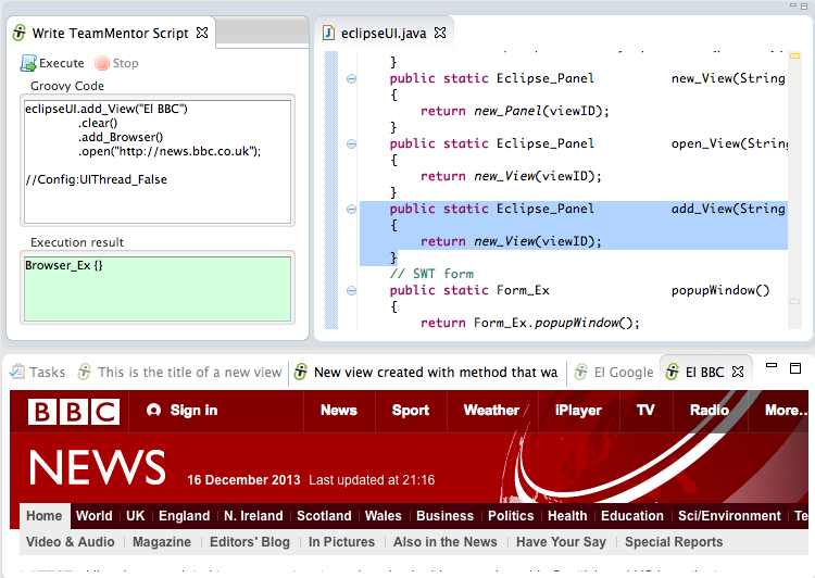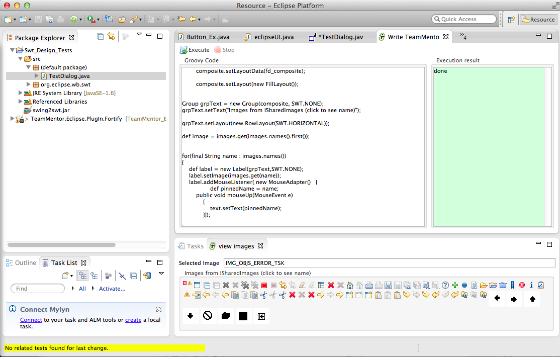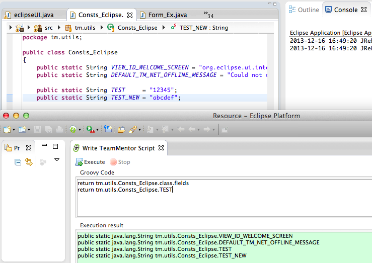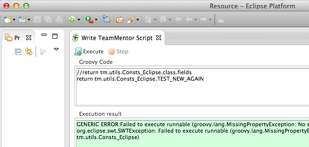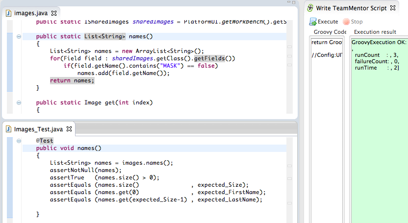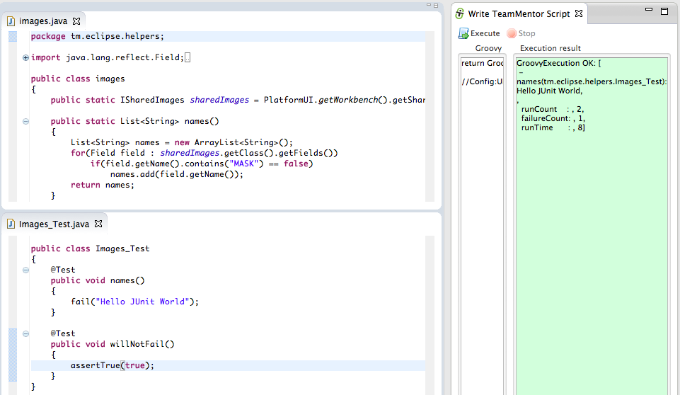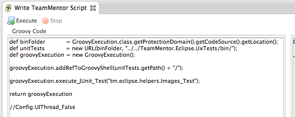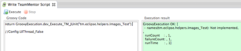 - Right is the Groovy Execution environment with only the return GroovyExecution.dev_Execute_TM_JUnit(“tm.eclipse.helpers.Images_Test”); script (which will execute the Images_Test.java JUnit test in less than 1 sec :)