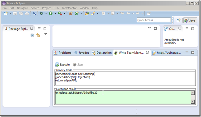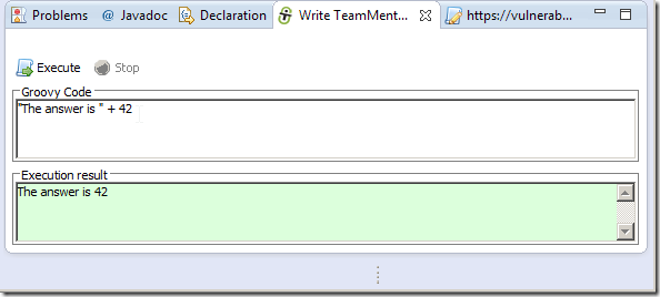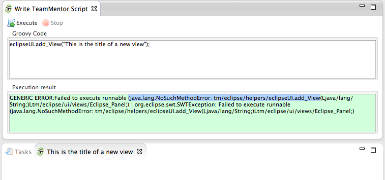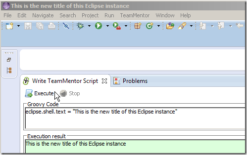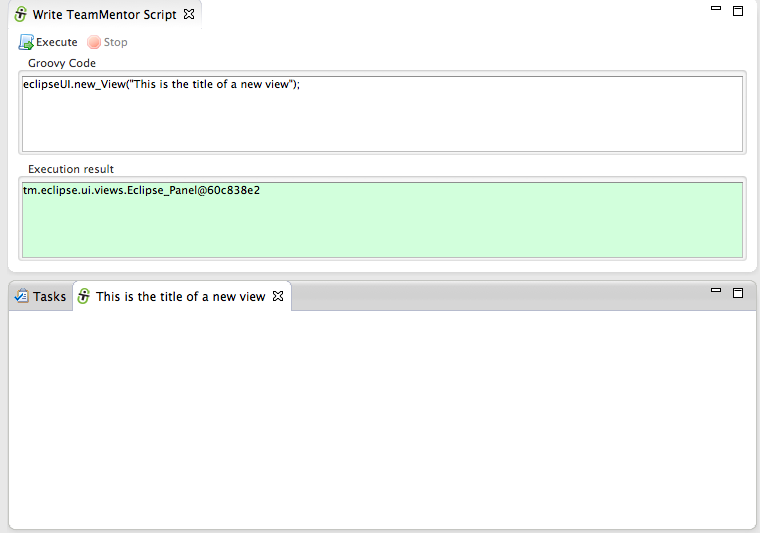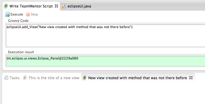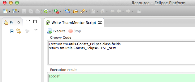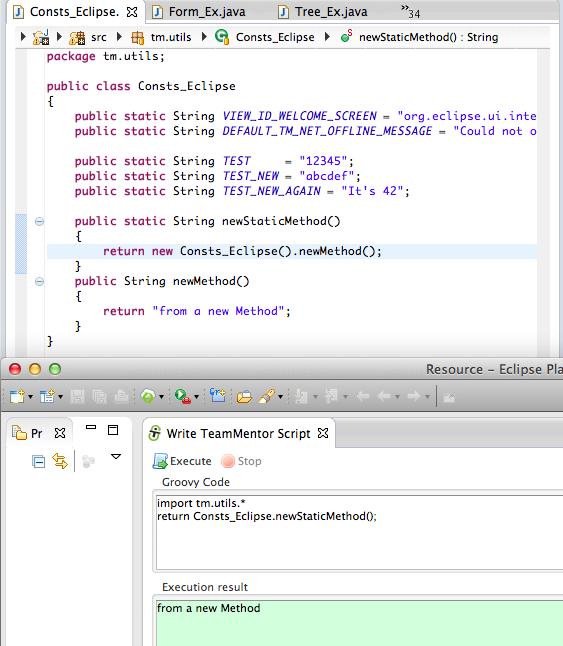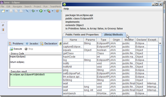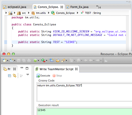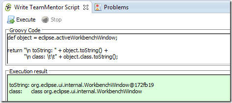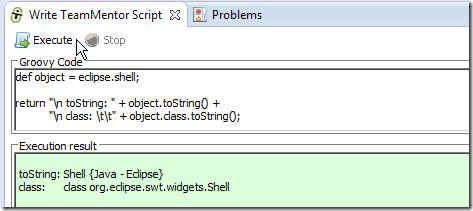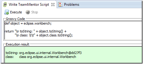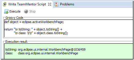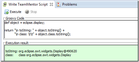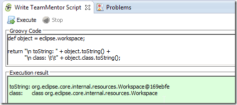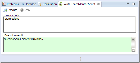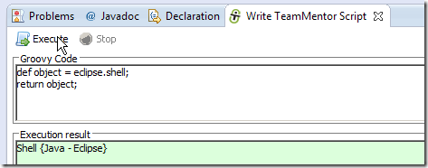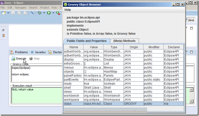 … and an eclipse object string representation (in this case tm.eclipse.api.EclipseAPI@1ffbe29) in the script UI’s Execution result panel