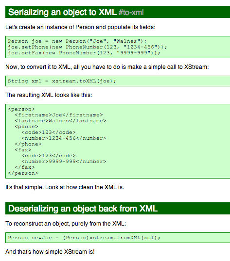 Here is an example of the XStream Serializing and Deserializing capabilities in action: