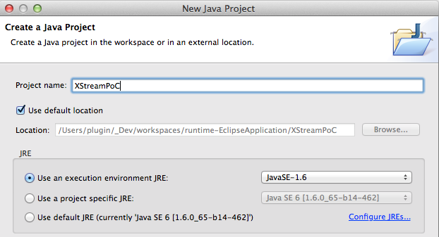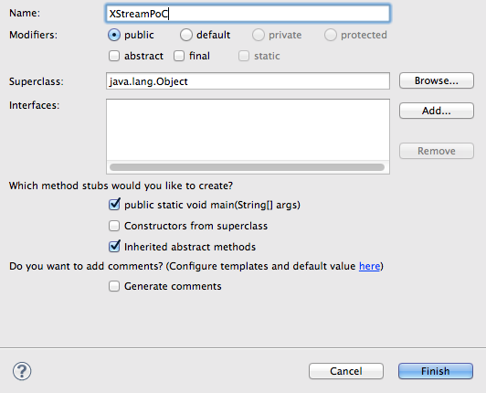 10) … called XStreamPoC (note tick the public static void main(String[] args) checkbox before clicking on Finish)