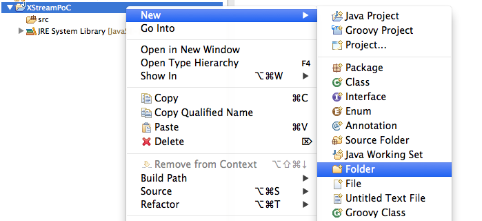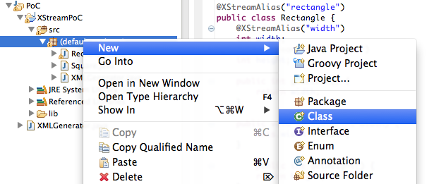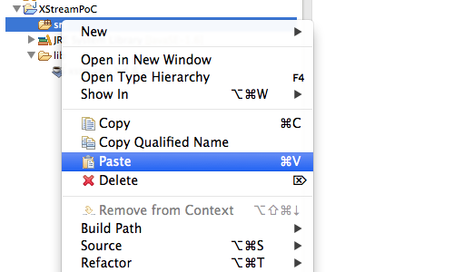6) In your browser, open the Standard way to serialize and deserialize Objects with XStream page, copy the contents of the XMLGenerator.java _** file (in the middle of the page), (back in Eclipse) select the **_src folder and select (or type) Paste