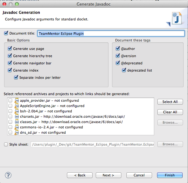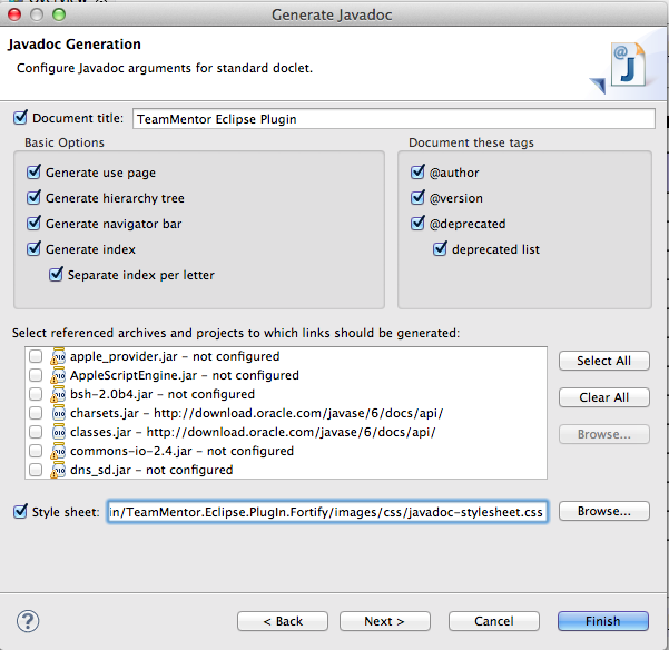 6) Next, I tried using a css (which I got from here) that I saved on a project’s folder and mapped it on this Generate JavaDoc wizard page: