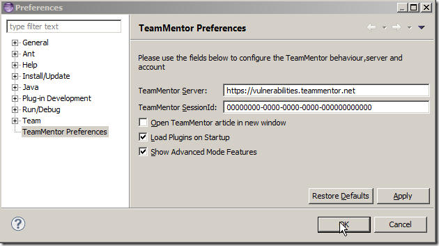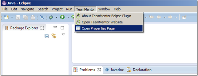 Once Eclipse starts, you should see a TeamMentor menu, where you need to click on the Open Properties Page menu item