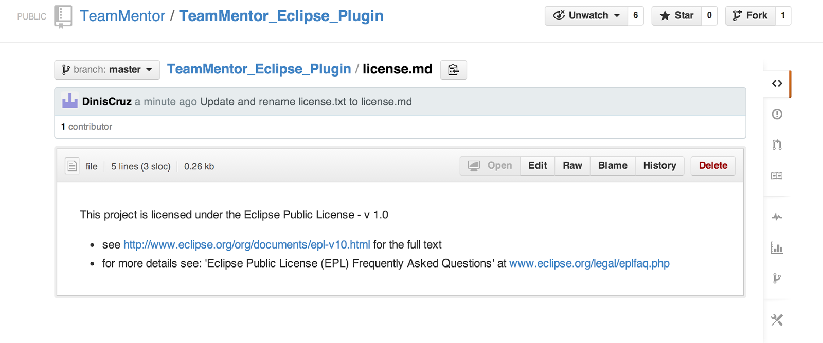 To make it ‘official’ all I did was to add the license.md file (screenshot below) to the https://github.com/TeamMentor/TeamMentor_Eclipse_Plugin and https://github.com/TeamMentor/TeamMentor_Eclipse_Plugin_Build repositories: