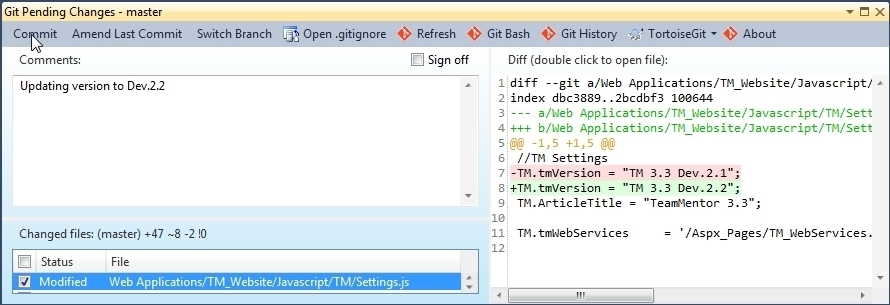 In VisualStudio, lets make a simple change (bumping the version to Dev.2.2)