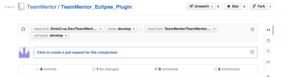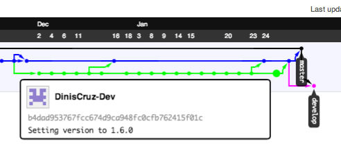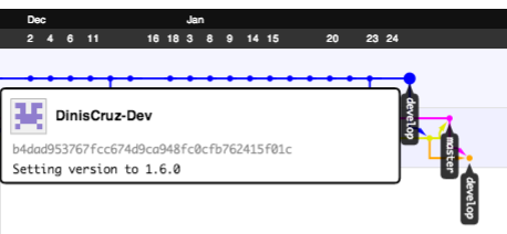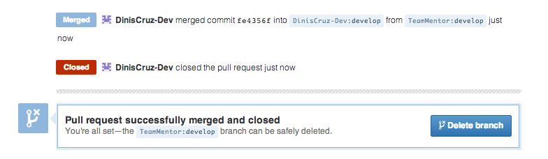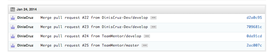 To see this in action, note how the Pull Request commits (into the master and develop branch) are made using the DinisCruz account: