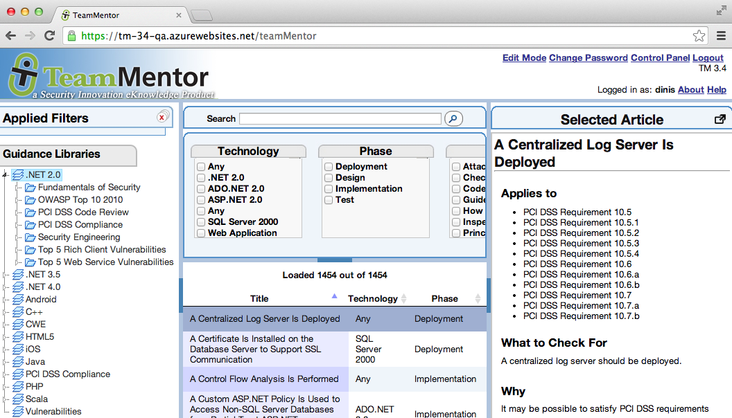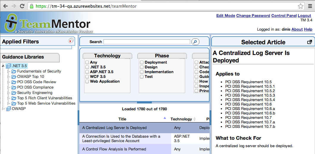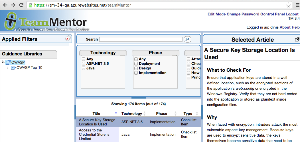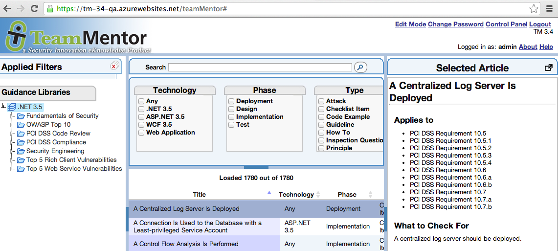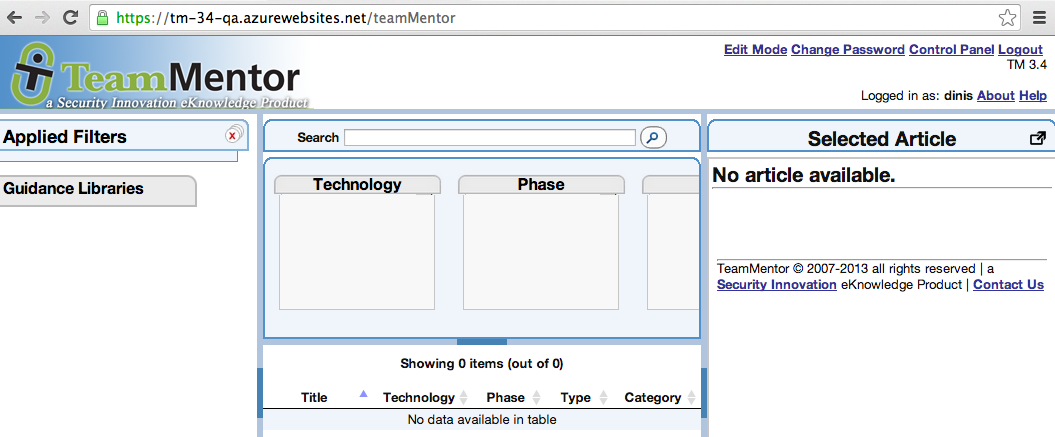 Opening up TeamMentor shows that we now have the new Library installed in this Azure server: