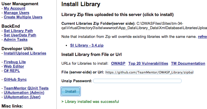 TIP: If you want to quickly add a test Library to TM, you can use the old /admin panel option to install Libraries from a link or zip. Here is how I quickly installed the OWASP Library, by clicking on the OWASP link in this page: