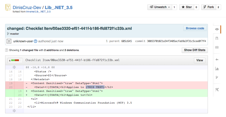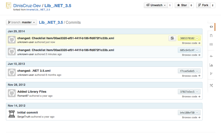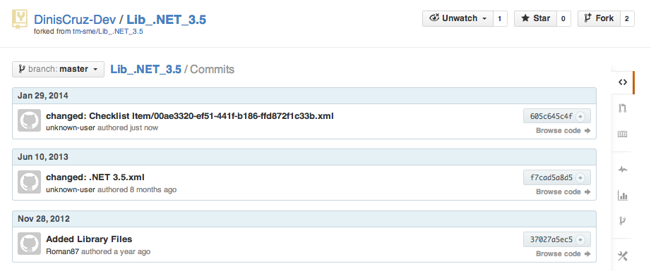 Once that is done, go back into the GitHub repo site, open the Commits page ([https://github.com/DinisCruz-Dev/Lib.NET_3.5/commits/master](https://github.com/DinisCruz-Dev/Lib.NET_3.5/commits/master)) and notice that there is an extra commit done just now (note: in TM 3.4 the commit is done under the server IIS user Git settings, which is usually not set, hence the value ‘unknown user’, in TM 3.6 there is already a fix to use the current TM Logged in user)
