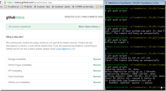 It took me 5 attempts over about 10m (from 7:40pm on 11th Mar 2013) to get a commit pushed into GitHub’s servers: