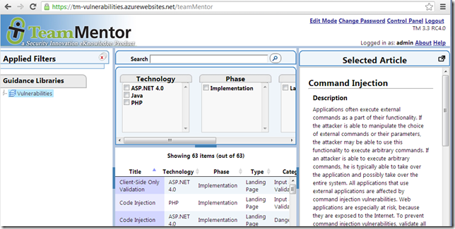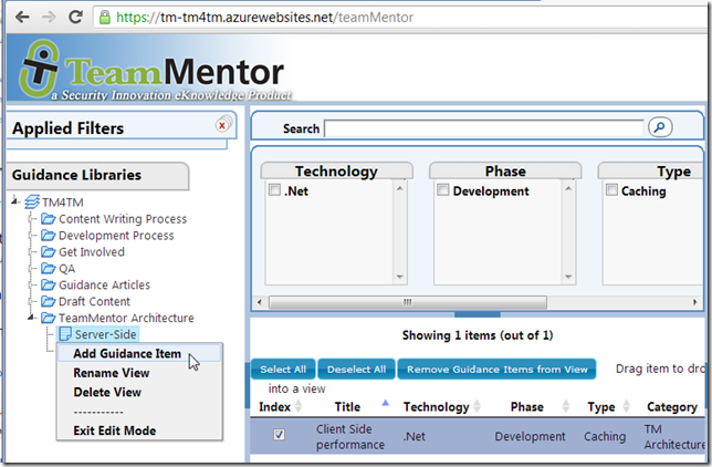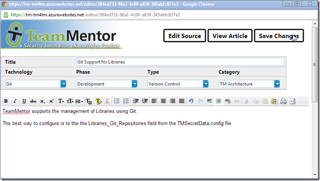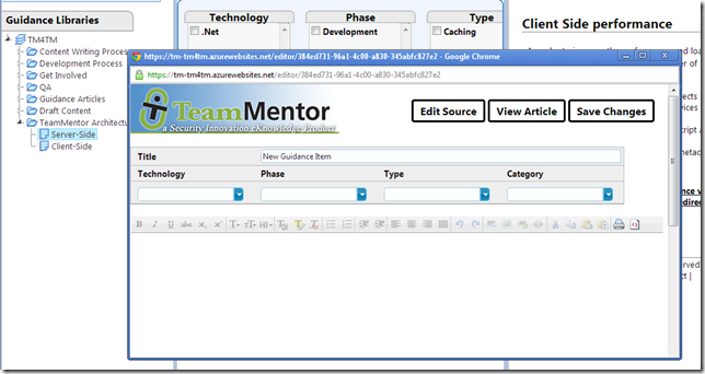 In the https://tm-tm4tm.azurewebsites.net server, lets’ add an new Guidance Item (i.e. an Article)