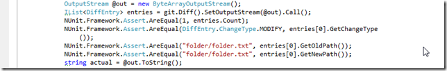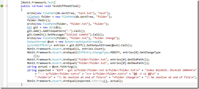 Our objective is to get the Diff formatted output shown in the NGit Unit test.