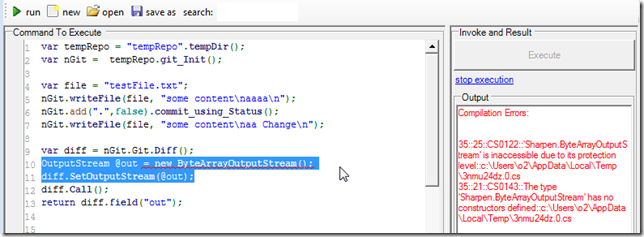 Note how the Sharpen.ByteArrayOutputStream was created and used on** Diff.SetOutputStream, but (as we will see below), we will have a problem because this class is internal: