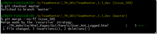 Next step is to checkout _**(into) master and do the **_git merge using the _–no–ff _