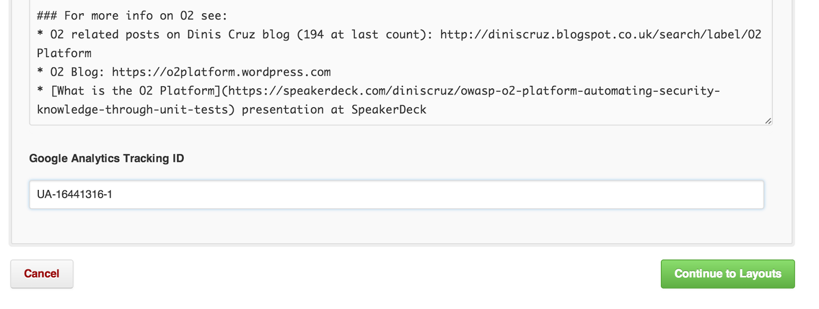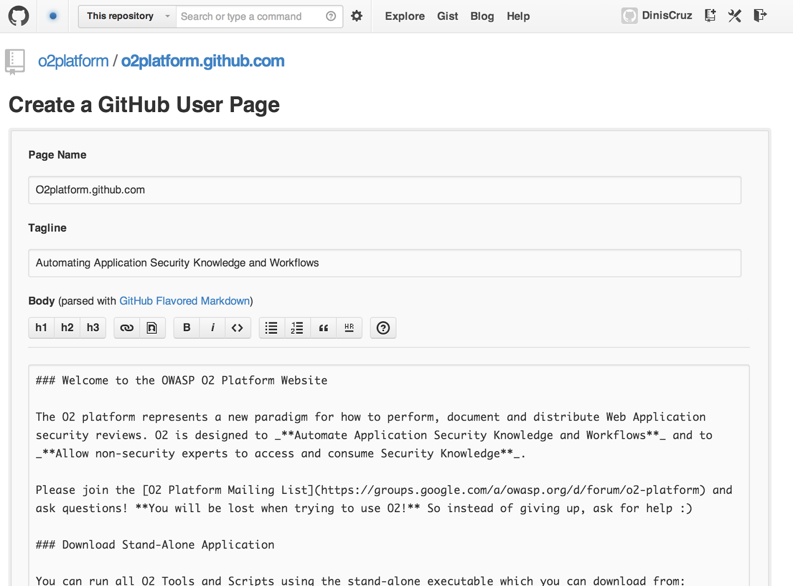 I went to the https://github.com/o2platform/o2platform.github.com** repo, and on the settings page, I clicked on the **Automatic Page Generator