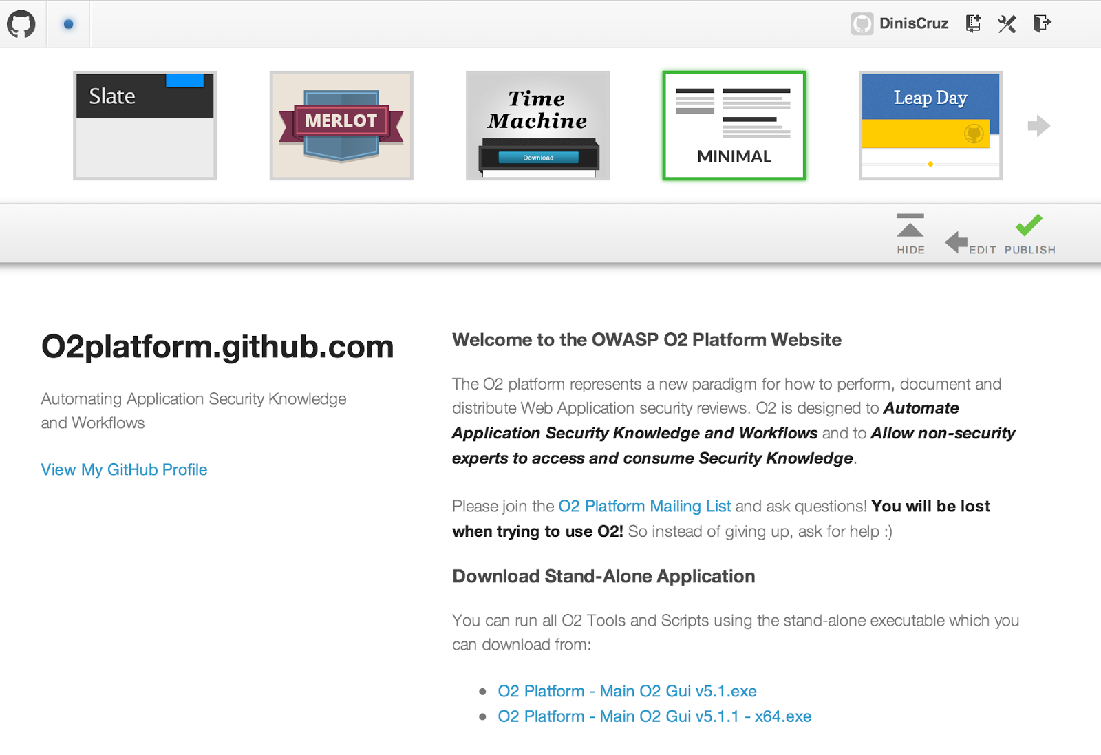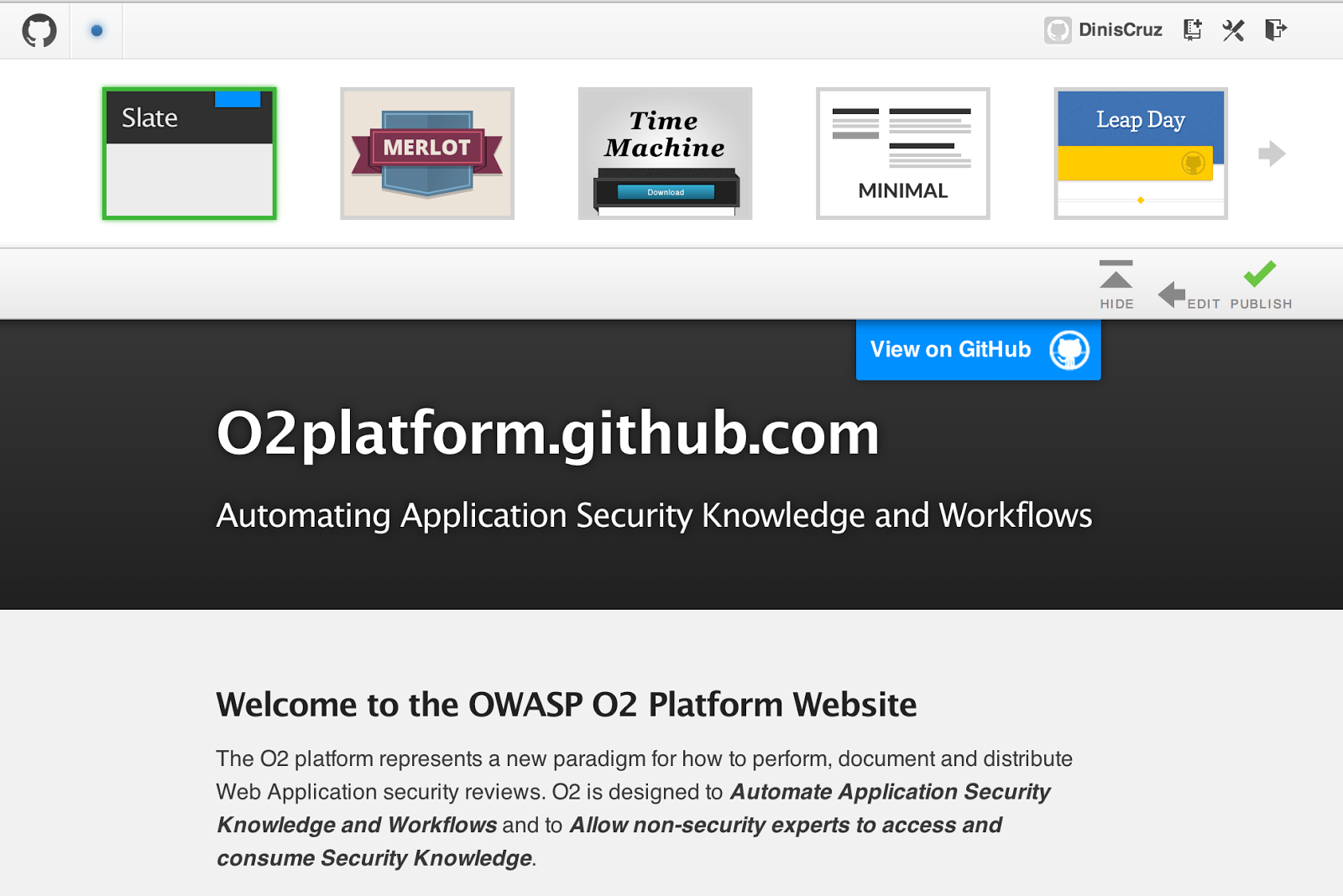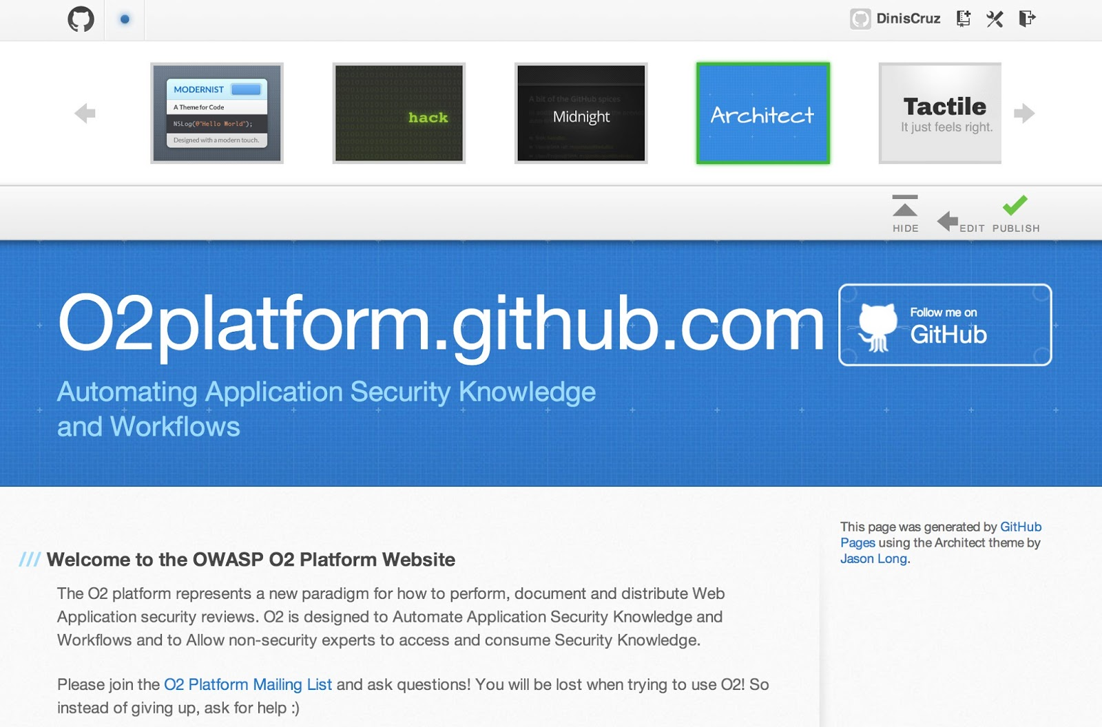 Creating o2platform.com website using GitHub Pages (with screenshots of all design options)