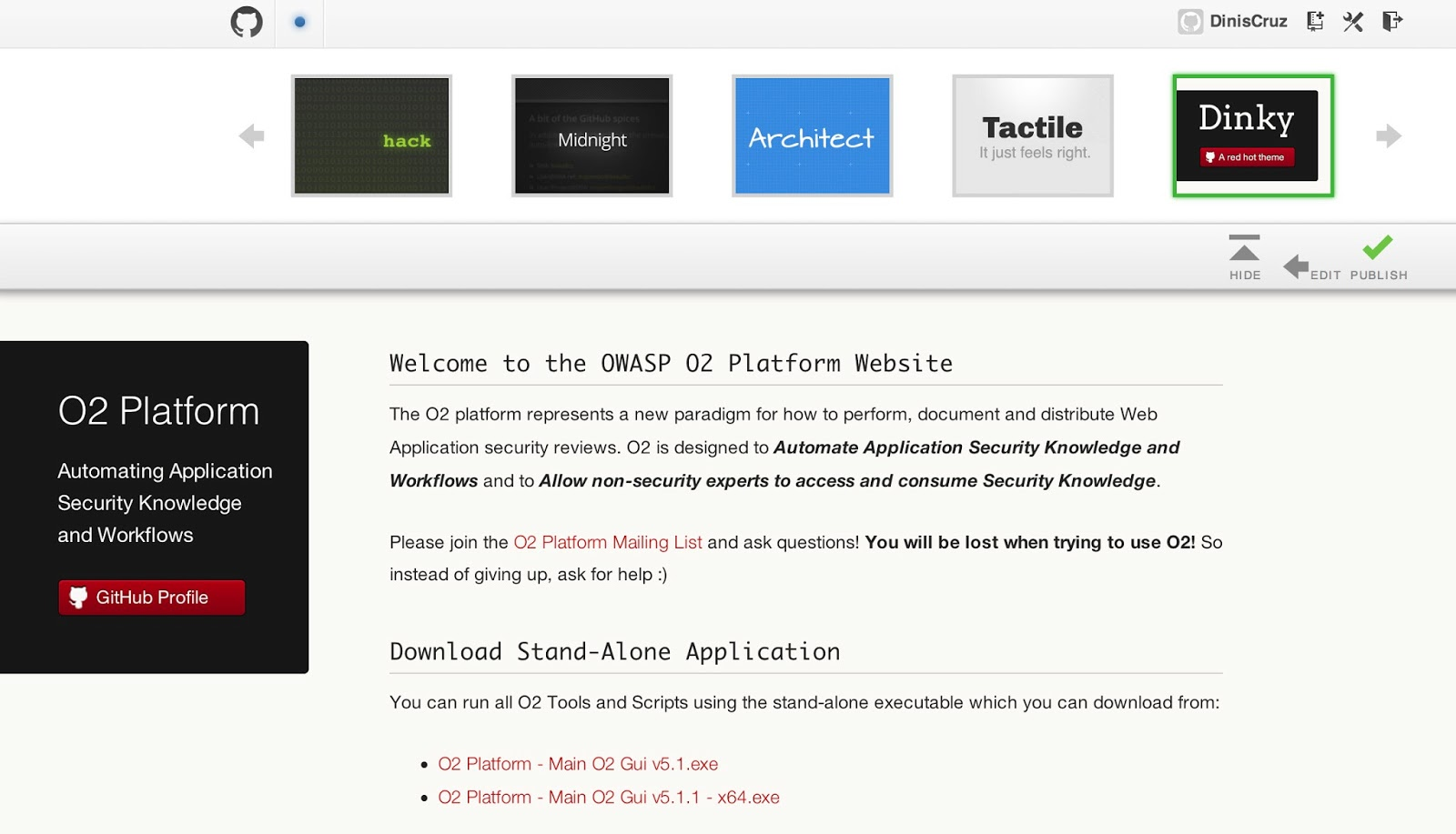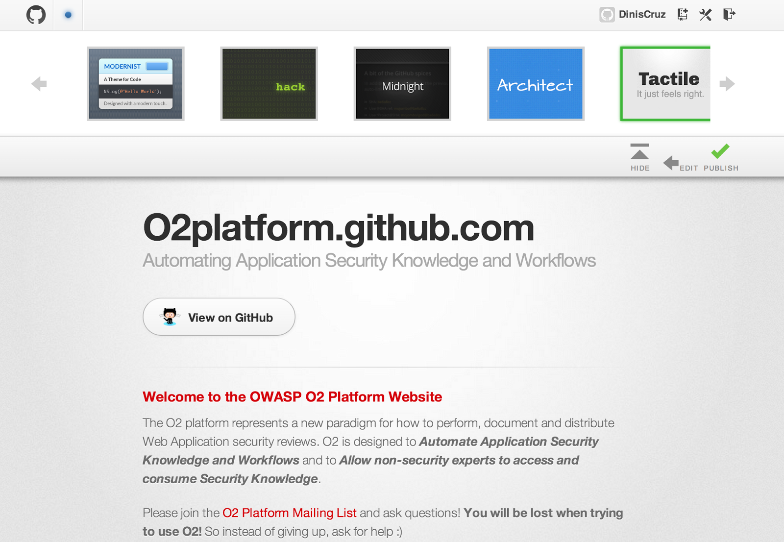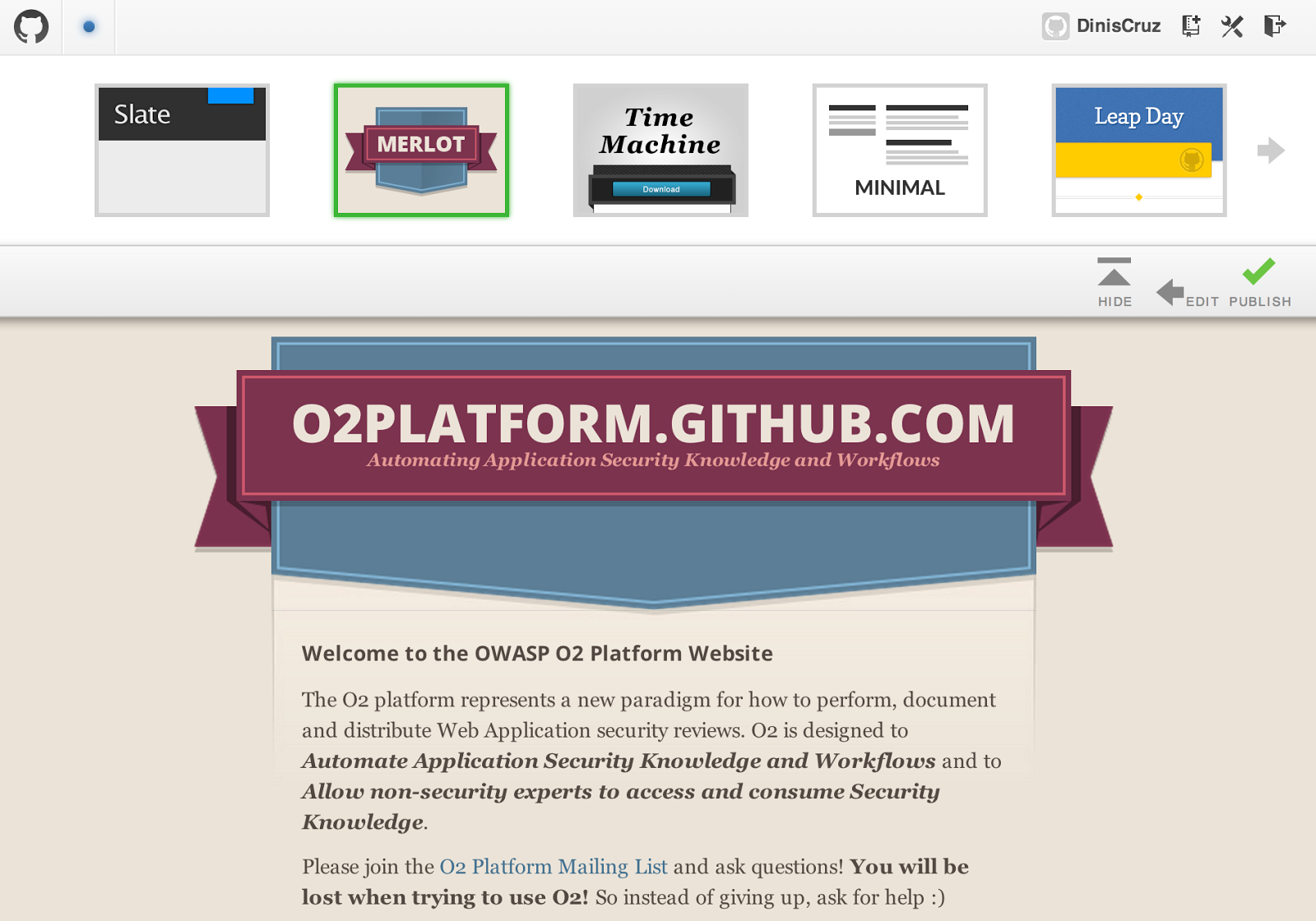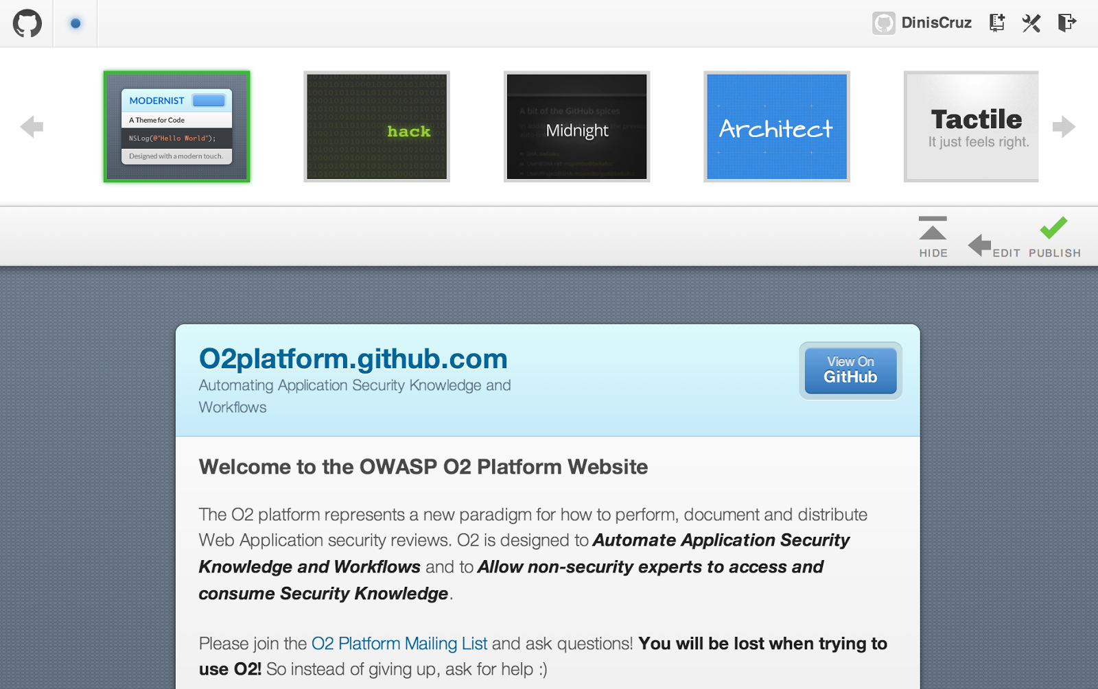 Creating o2platform.com website using GitHub Pages (with screenshots of all design options)