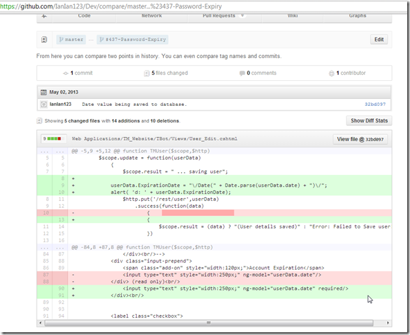 At this stage if we look at Ian’s network map, we will see that this commit is not linked to another commit (i.e. is the last one of the #437-Password-Expiry branch