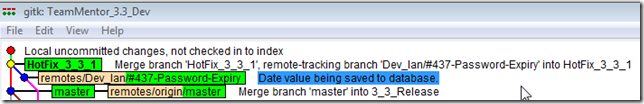 Since we are now using the Vincent Driessen GitFlow branching model (see also these Git-Flow scripts and this great presentation), after the issue 437 was reported+prioritised, all development happened on a Feature Branch called HotFix_3_3_1 (which was created from a Pull Request from Ian’s own 437-Password-Expiry dev branch).