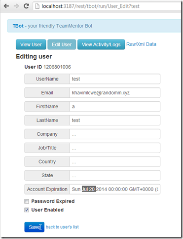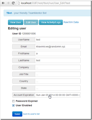 7) changed the expiration date (this was the issue 437 since it was not possible to change this value from the web (only via GitHub (see Changing a User’s ExpiryDate from GitHub hosted file) or REPL script (see Using CSharpRepl to batch change TeamMentor’s users email and settings))