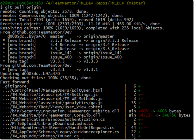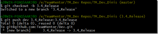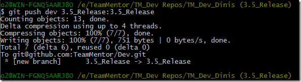 I then pushed the 3.3.3_Release branch and v3.3.3 tag into the TeamMentor/Dev repository, using the commands: $ git push dev 3.3.3_Release:3.3.3_Release and $ git push dev v3.3.3