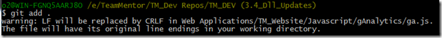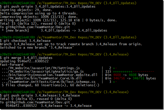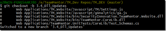 Keeping up with the model of only doing commits on branches, I quickly created a new branch, using the command: $ git checkout –b 3.4_Dll_Updates