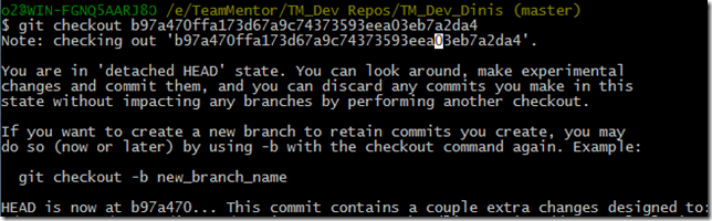 To do so, I started by opening up my local dev repo (currently in sync with the latest commit to Dev) , and executed $ git checkout b97a470ffa173d67a9c74373593eea03eb7a2da4