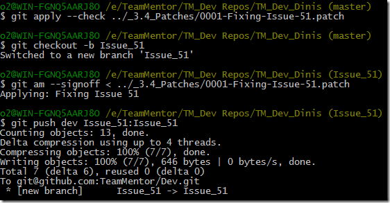$ git am –signoff < ../_3.4_Patches/0001-Fixing-Issue-51.patch (apply patch and preserve original commit) $ git push dev Issue_51:Issue_51 (push branch into GitHub)