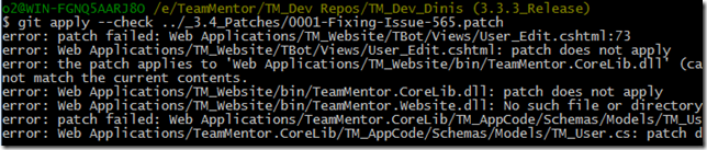 For example this is what happened for the 0001-Fixing-Issue-565.patch when executing the command $ git apply –check ../_3.4_Patches/0001-Fixing-Issue-565.patch
