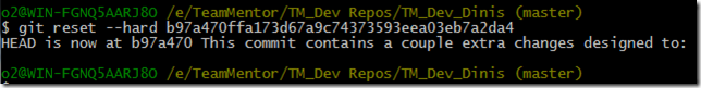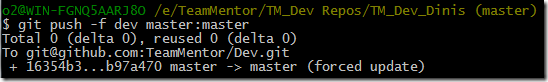 We’re going to (first locally) do a hard reset into the b97a470ffa173d67a9c74373593eea03eb7a2da4 commit, using the command $ git reset –hard b97a470ffa173d67a9c74373593eea03eb7a2da4 (remember that this commit is the common one between TeamMentor/Master and TeamMentor/Dev)