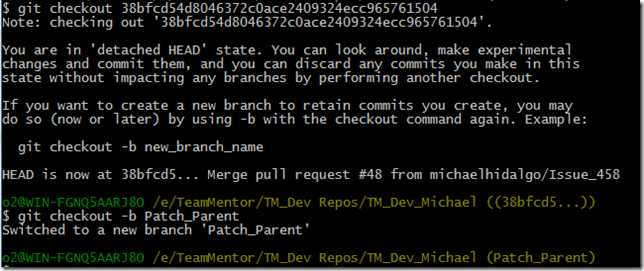 38bfcd54d8046372c0ace2409324ecc965761504 commit, using the commands: $ git checkout 38bfcd54d8046372c0ace2409324ecc965761504 _** and **$ git checkout -b Patch_Parent_
