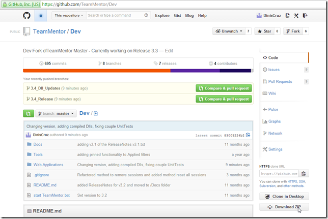 A final test is to go to the main https://github.com/TeamMentor/Dev site and click on the Download Zip button: