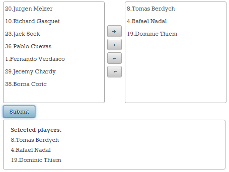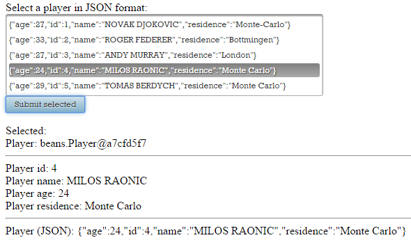 Further, a managed bean contains a List<Player> (the Player instances from this List will “feed” the selectable items with values that the user will see as readable strings, as labels):