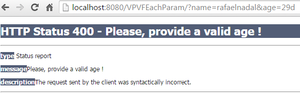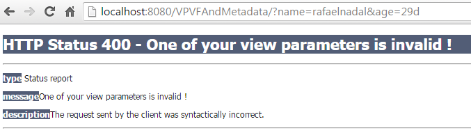 As you can see, we have two view parameters. Letʹs suppose that we want to perform a redirect, if the first view parameter (nameId) validation fails, and to send a HTTP error status, if the second view parameter (ageId) validation fails. We can easily adjust the above approach to obtain a general solution, but we can also use a particular approach and do something like this: